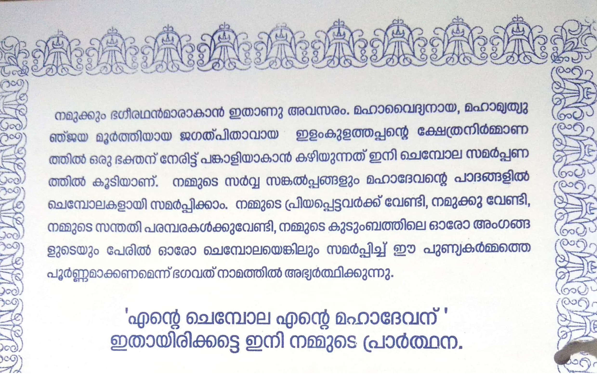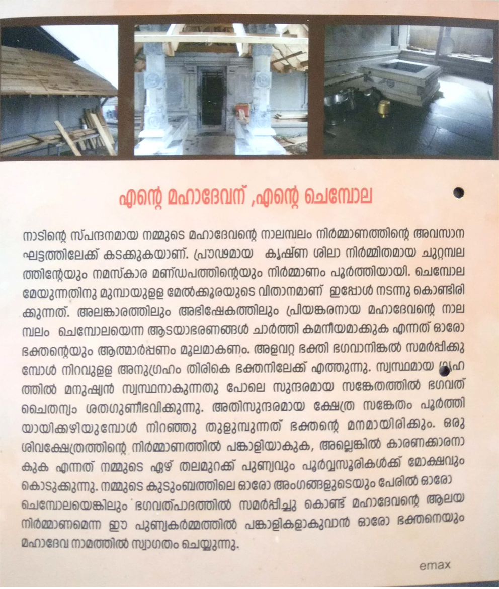 നാടിന്റെ സ്പന്ദനമായ നമ്മുടെ മഹാദേവന്റെ നാലമ്പലം നിർമ്മാണത്തിന്റെ അവസാന ഘട്ടത്തിലേക്ക് കടക്കുകയാണ്. പ്രൗഢമായ കൃഷ്ണ ശിലാ നിർമ്മിതമായ ചുറ്റമ്പലത്തിന്റെയും നമസ്കാര മണ്ഡപത്തിന്റെയും നിർമാണം പൂർത്തിയായി. ചെമ്പോല മേയുന്നതിനു മുമ്പായുള്ള മേൽക്കൂരയുടെ വിതാനമാണ് ഇപ്പോൾ നടന്നു കൊണ്ടിരിക്കുന്നത്. ഒരു ശിവക്ഷേത്രത്തിന്റെ നിർമ്മാണത്തിൽ പങ്കാളിയാകുക, അല്ലെങ്കിൽ കാരണക്കാരനാകുക എന്നത് നമ്മുടെ ഏഴ് തലമുറക്ക് പുണ്യവും പൂർവ്വസൂരികൾക്ക് മോക്ഷവും കൊടുക്കുന്നു. നമ്മുടെ കുടുംബത്തിലെ ഓരോ അംഗങ്ങളുടെയും പേരിൽ ഓരോ ചെമ്പോലയെങ്കിലും ഭഗവത്പാദത്തിൽ സമർപ്പിച്ചു കൊണ്ട് മഹാദേവന്റെ ആലയ നിർമ്മാണമെന്ന ഈ പുണ്യകർമ്മത്തിൽ പങ്കാളിയാകുവാൻ ഓരോ ഭക്തനെയും മഹാദേവ നാമത്തിൽ സ്വാഗതം ചെയുന്നു.
